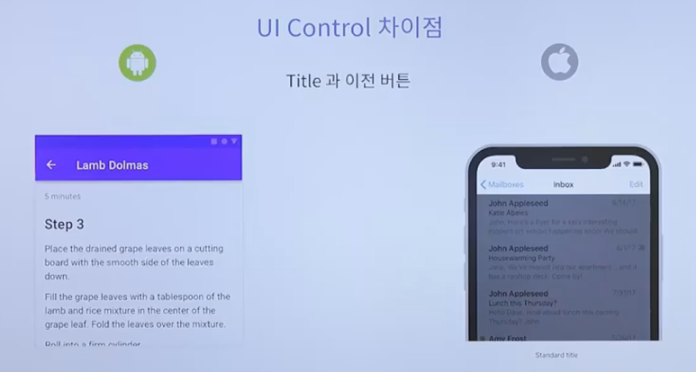 안드로이드와 iOS의 차이점 4 - Title의 위치와 이전 버튼의 모양이 다르다. (안드로이드 - 타이틀 좌측 정렬, 이전 버튼은 화살표 모양(←) / iOS - 타이틀 가운데 정렬, 이전 버튼은 꺽쇠 모양( < )+텍스트)