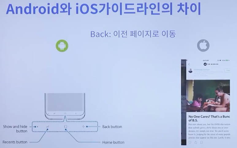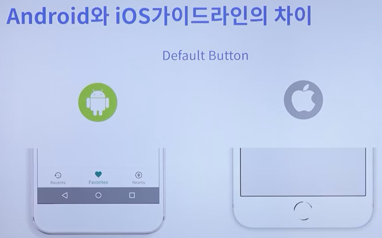 안드로이드와 iOS의 차이점 1 - 디폴트 버튼이 다르다. (iOS는 뒤로가기 버튼이 디폴트 값으로 설정되어 있지 않음)