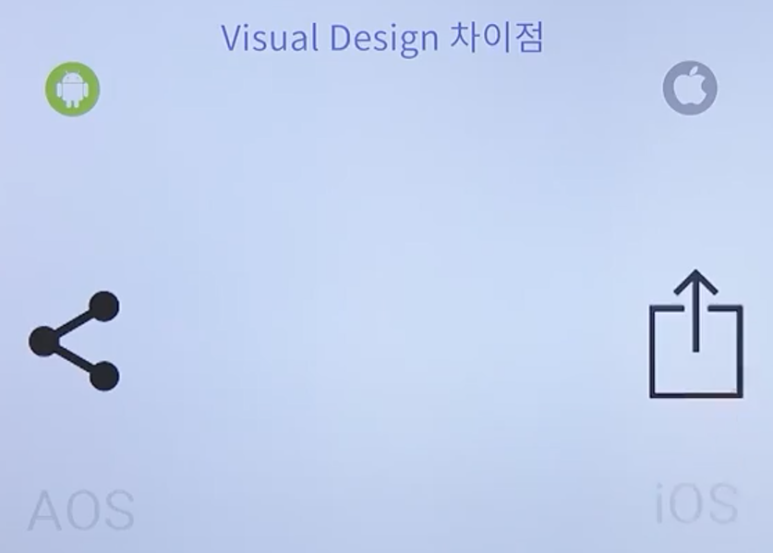 Visual Design이 다른 가장 대표적인 예시 - 공유하기 아이콘의 모양 & Dialog Text의 배열 (안드로이드 - dialog는 좌측 정렬, 취소·확인 버튼은 우측 정렬 / iOS - dialog와 취소·확인 버튼 모두 가운데 정렬)