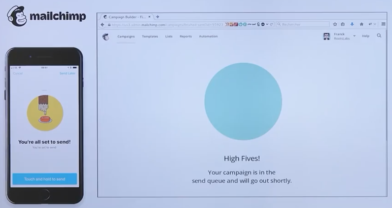 피크엔드 법칙을 이용해서 사용자의 경험을 개선한 서비스 사례 - 메일침프 : 사용자가 메일을 다 작성하고 보내지 않고 있으면 메일 보내기를 유도하는 아이콘이 표시되고, 메일을 보내고나면 고생했다는 의미로 사용자의 감정을 불러일으킬 수 있는 하이파이브 아이콘을 표시한다.